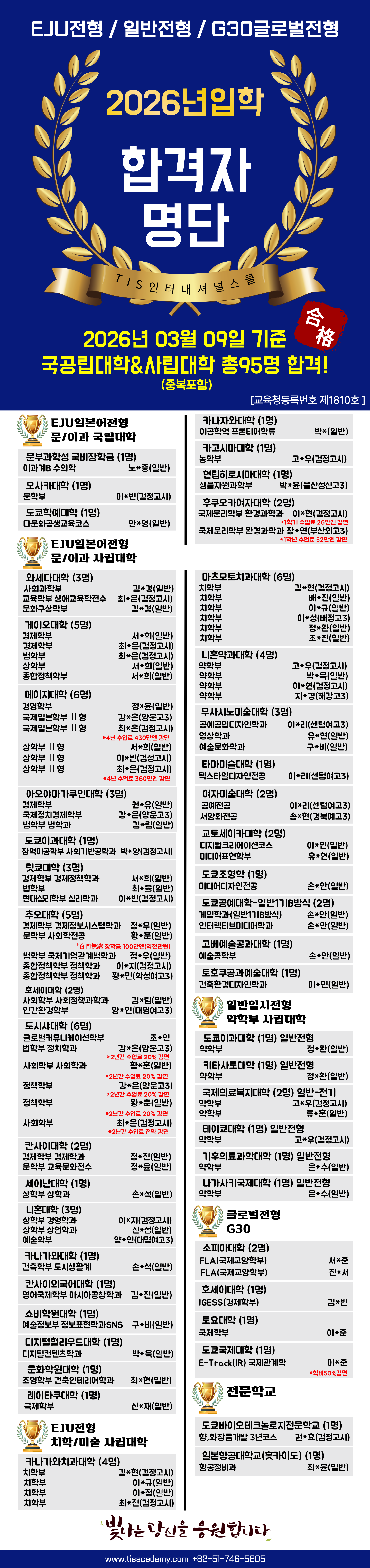 교육분야 [T관] TIS외국어학원 - 일본어/영어 기초, 키즈/성인 일본어, JLPT 전문 [T관] TIS에듀재팬유학원 - EJU전략상담/원서지원, G30글로벌 입시컨설팅 전문 [I관] TIS일본어회화마스터유학원 - 일본어회화, 면접대비, 전문학교, 어학연수 전문 [S관] TIS일본대학입시학원 - EJU전과목, 토플, 본고사 전문 | 학원위치 [T관본원] 48094 부산시 해운대구 해운대로 600 홍정빌딩 5층 [I관] 48094 부산시 해운대구 해운대로 620 라뮤에뜨 3층 301호 [S관] 48094 부산시 해운대구 해운대로 598 CW마린 6층 |